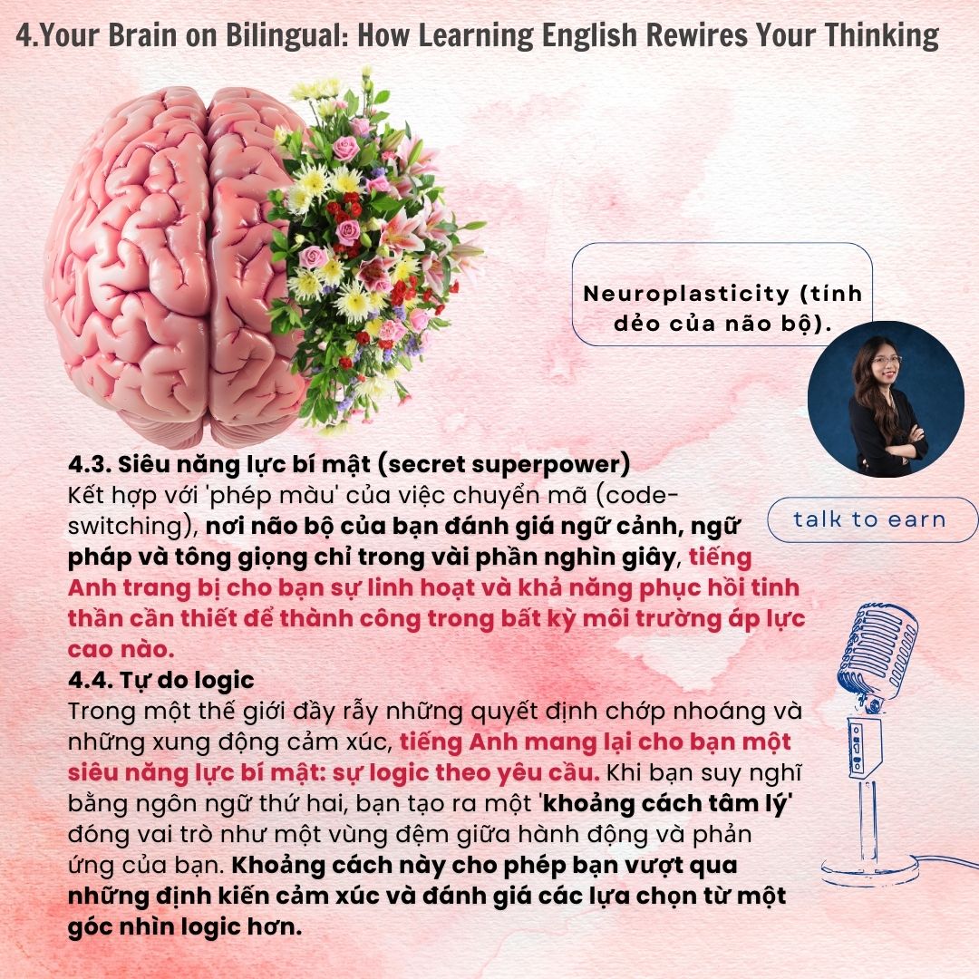 Nghiên cứu về Neuroplasticity tính dẻo của bộ não và hình ảnh chụp não của những người học 2 ngôn ngữ (bilingual) cho thấy học tiếng Anh không chỉ đơn thuần là, mở ra các cơ hội việc làm hay khả năng vào đại học, mà quá trình học đã thực sự rèn luyện lại bộ não của mình để có khả năng tập trung, ghi nhớ, linh hoạt và ra quyết định tốt hơn.